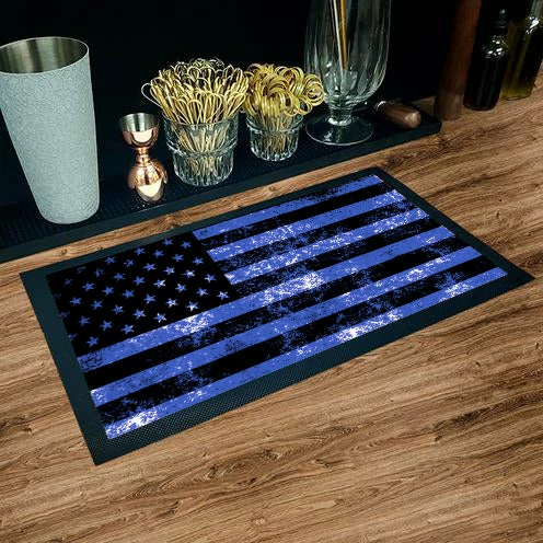 Service mats add a great utility to bar and kitchen tops by protecting them from splatters and spills during high traffic service. The durable rubber matting on the bottom and framing the sides will hold the mat securely in place. This patriotic American Flag design will definitely bring the perfect decor element to your bar or kitchen. These mats can also be used as place settings.