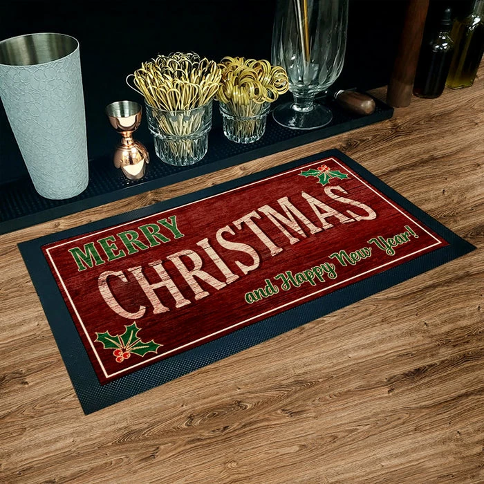 Service mats add a great utility to bar and kitchen tops by protecting them from splatters and spills during high traffic service. The durable rubber matting on the bottom and framing the sides will hold the mat securely in place. This holiday inspired design will definitely bring the perfect decor element to your bar or kitchen. These mats can also be used as place settings.