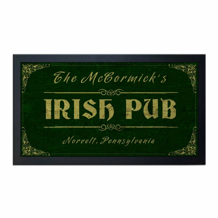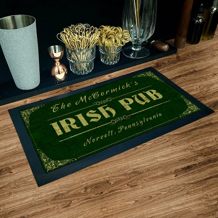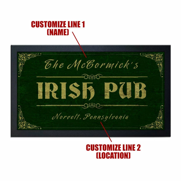 Service mats add a great utility to bar tops by protecting them from splatters and spills during high traffic service. The durable rubber matting on the bottom and framing the sides will hold the mat securely in place. Now you can enjoy the ability to customize your own Bar Service Mat with your name and branding. Among several designs, this easily customizable full color Irish Pub theme is sure to add a fun decor element to any type of bar setting. Simply type in your text and we do the rest! These mats can also be used as place settings.