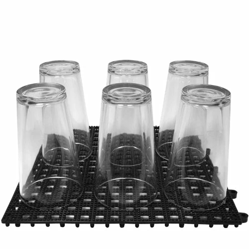 These 12″ x 12″ interlocking bar shelf mats snap together with each other and can be cut to accommodate any work space. The legs underneath the mat creates a 9/16th inch space that allows air in for quicker and more sanitary drying and enough room so that spills don’t touch whats on them. Great for bars, restaurants, diners, hotels, and more. These interlocking mats clean up easily and come in four colors: Green, Red, Black, and Blue.