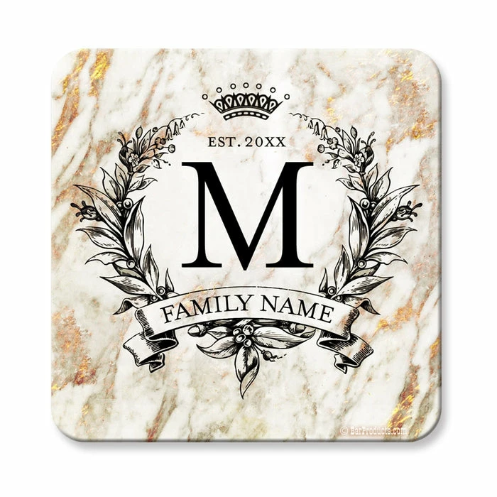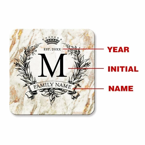 Decorate your tables and set drinks down in style with this Marble Monogram square cork bottom coaster! Each coaster features a printed marble design and personalized monogram with your custom year, initial and name. These coasters measure the standard 4″ x 4″ coaster size and feature a quality cork bottom that prevents slipping and scuffing on table tops.
