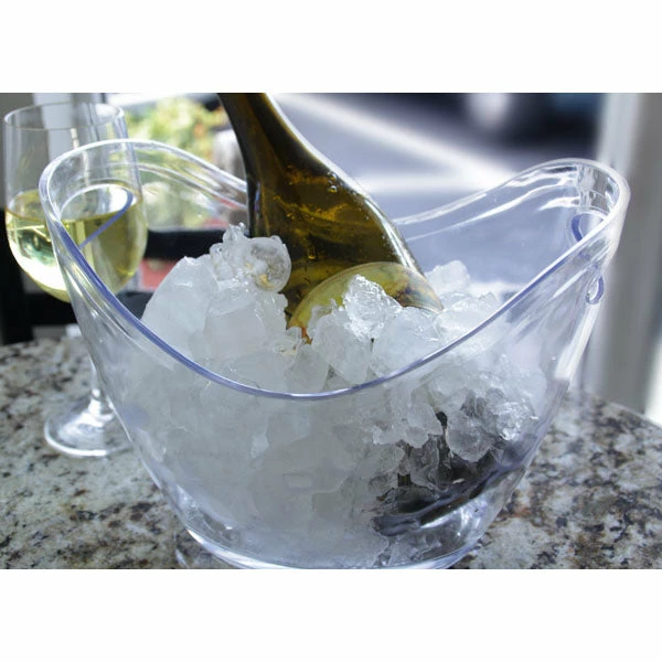 The Premium Acrylic Ice Bucket is the perfect size for holding your favorite bottle of wine or champagne. This is an elegant and modern looking ice bucket will surely impress your guests whether you are using in a restaurant or at home for a small gathering. The unique gondola style with its convenient handles looks great and will keep your bottles perfectly chilled. Can be used indoors or outside.