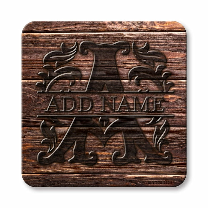 Decorate your tables and set drinks down in style with this Wood Monogram square cork bottom coaster! Each coaster features a printed wood design and personalized monogram letter with your custom name and initial. These coasters measure the standard 4″ x 4″ coaster size and feature a quality cork bottom that prevents slipping and scuffing on table tops.