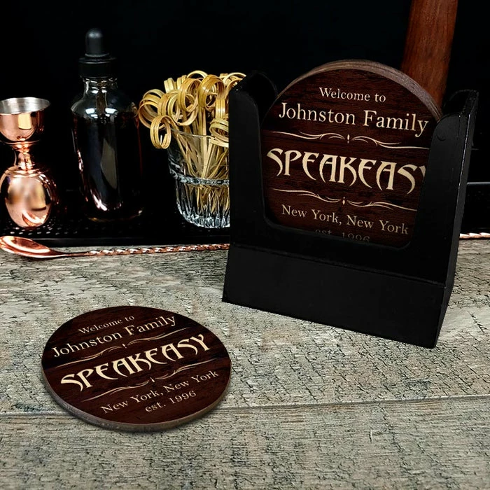 Looking for a non-disposable coaster solution that will look phenomenal displayed on your bar or table tops? How about one that is easily customizable and showcases a trendy “Speakeasy” design theme? These custom wood coasters are just what you’ve been looking for! Handcrafted in the USA, these high quality coasters allow for full color design while featuring a rustic wood element. Very easy to customize, simply type in your text and we do the rest! These coasters also make for a great gift idea! 4 inch round shape. Sold in packs of 4 with a wooden coaster caddy add-on option.